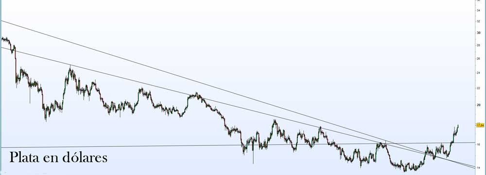 Por su parte la plata superó la zona de resistencia de los 16,25$/onza existiendo lo que parecen ser indicios técnicos de que la fase bajista queda atrás y que podría iniciarse un movimiento sostenido al alza. Téngase en cuenta que la plata es mucho más volátil que el oro y que la caída que parece que está concluyendo arranca desde los 50$/onza.
